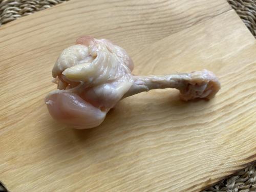 手羽元の下処理をする。皮を骨にそってぐるりと一周切る。骨の周りに付いている薄皮も一緒に切っておく。切った皮の部分を下にめくるように引っ張ると簡単にはがれる。丸く形を整える。
