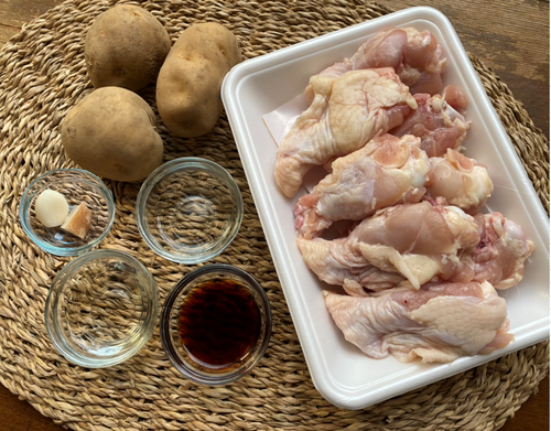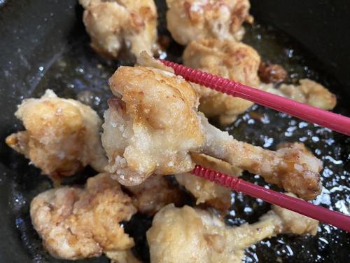 下味を付けた手羽元に片栗粉をまぶし、じゃがいもを揚げたものと同じ油でカラリと揚げる。