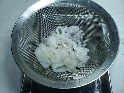 イカのわた・皮を取り除き、軟骨を引き抜く。胴体は1cmの輪切りに、ゲソは3cmぐらいに切りそろえておく。苦手なら、下ごしらえ済みのイカを使うと時短にもなる。