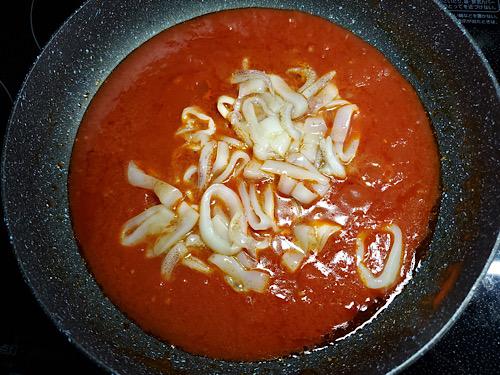 トマトソースがふつふつと湧いてきたら、火力を落とさずにイカを入れて1分加熱し、火を止める。パスタを時間よりも1分短く茹で上げたら、フライパンに入れて手早く絡ませ、盛り付けてできあがり。