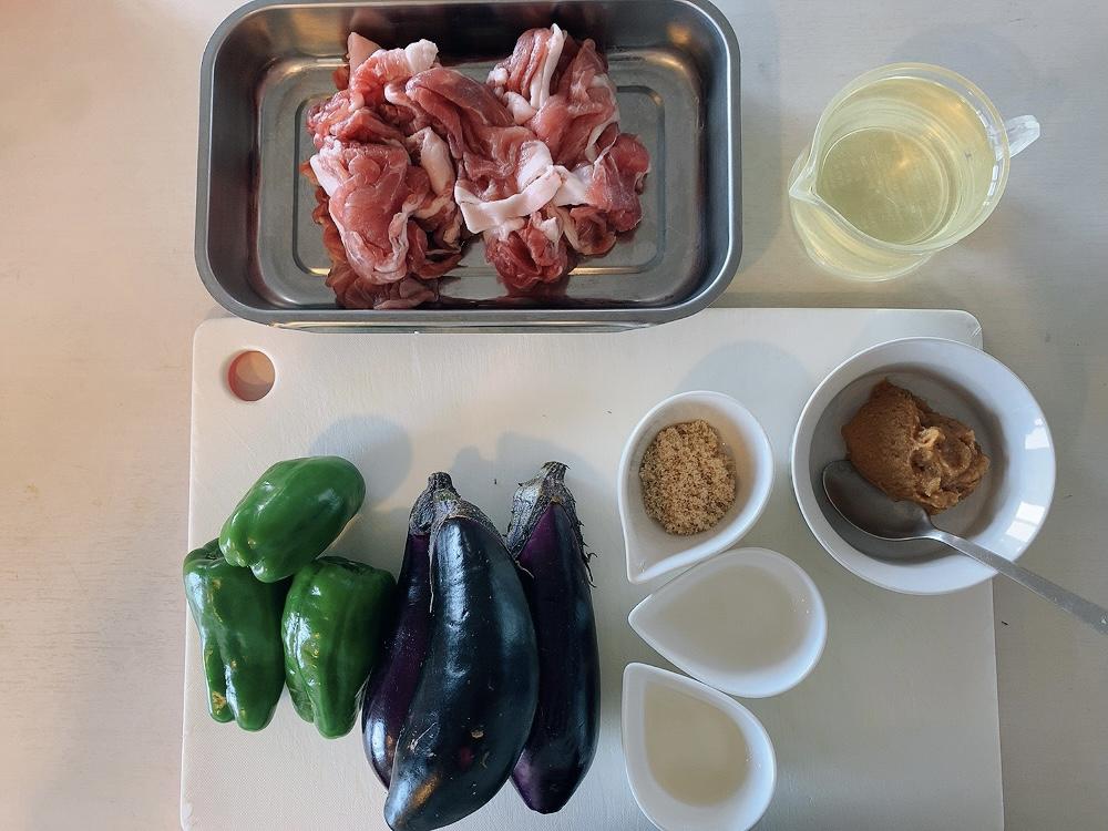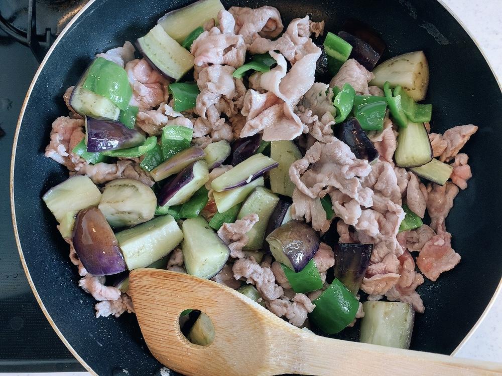 フライパンにサラダ油をひき、豚肉、ピーマン、ナスを炒める。豚肉に火が通ったら、合わせ調味料を加える。全体的に味がなじんだら、完成となる。