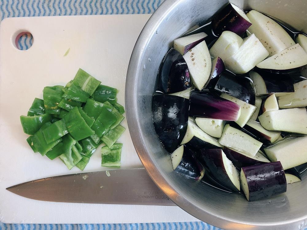 Step.1 ピーマンとなすをカットして、素揚げにする