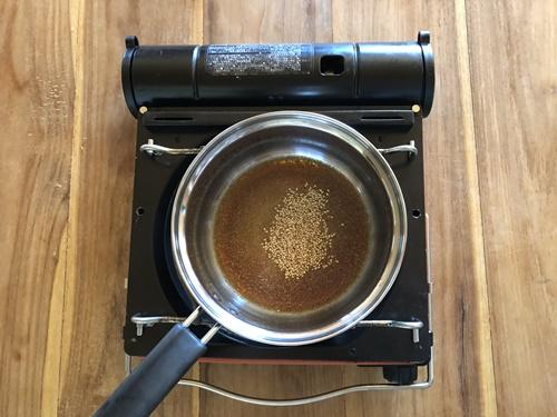 鍋に酒、みりん、醤油、白だし、すりごま、いりごまを入れ、ひと煮立ちさせる。