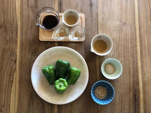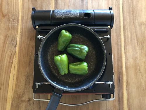 フライパンにごま油をひき、ピーマンを入れてふたをして弱火で加熱する。ときどきひっくり返し、焦げ付かないように注意しながら色が変わるまでくたくたに焼く。