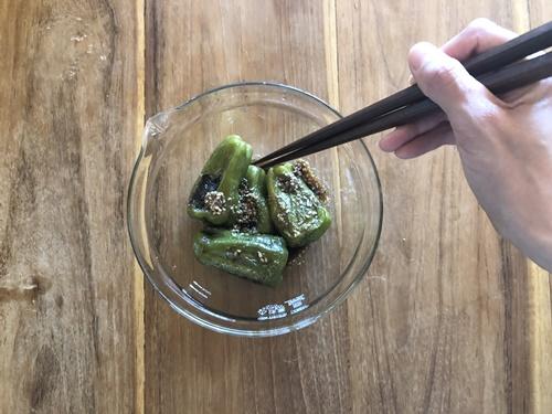 ボウルに焼いたピーマンと、調味液を入れて混ぜ合わせる。すぐに食べても美味しいが、10分以上寝かせると味がなじんで、より旨みが増すのでおすすめだ。