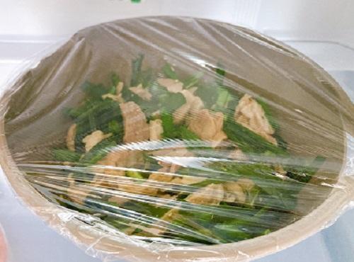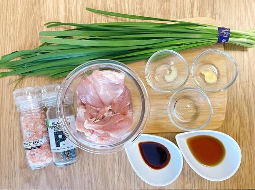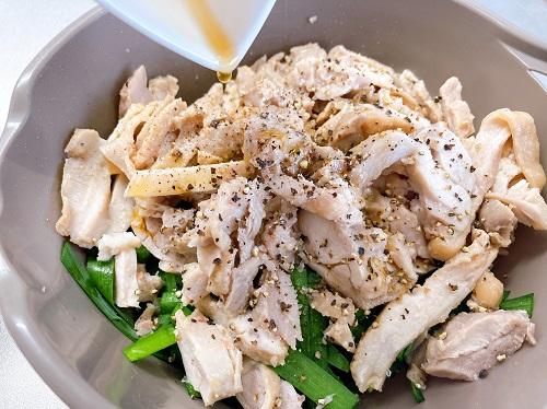 鶏もも肉を取り出し、中心部まで加熱できていることを確認して薄切りにする。ニラもよく洗ったら、3cmほどに切る。それぞれをボウルに入れ、残りのごま油と塩コショウを加えてよく和える。