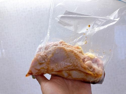 鶏もも肉にフォークで穴を空ける。密閉できる袋に入れ、しょうが、にんにく、醤油、料理酒、ごま油(半量)をもみこむ。