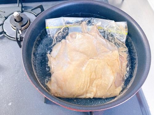 鍋にお湯を沸かし、鶏もも肉を袋ごとそのまま入れる。沸騰させたまま10~15分ほど茹でる。中ぶた(アルミホイルでもOK)とふたをして、火を止める。触れられる温度(40~50度程度)になるまで放置する。