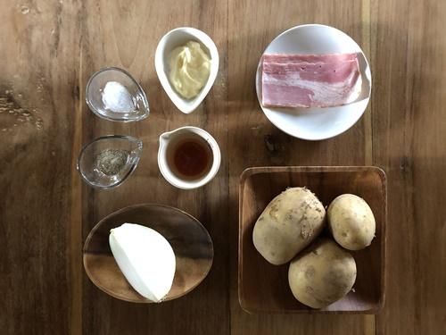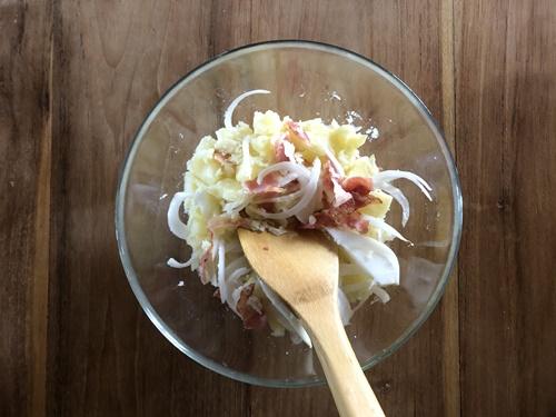 マッシュしたじゃがいもに、新玉ねぎ、ベーコン、マヨネーズ、塩、タバスコ、ブラックペッパーを入れてよく混ぜ合わせる。