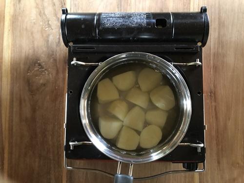 じゃがいもは皮をむいて四等分にカットし、水に入れて火にかける。竹串ですっとささる程度にやわらかくなるまで、沸騰してから10~15分程茹でる。じゃがいもの大きさや種類でやわらかくなるまでの時間に差があるので注意する。