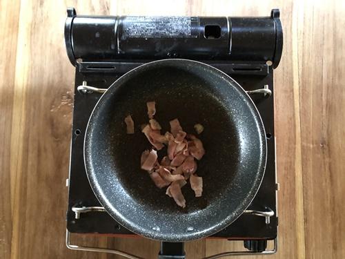 新玉ねぎは千切りにする。ベーコンは1㎝幅程に切り、フライパンでカリカリになるまで炒める。
