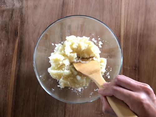 じゃがいもは茹であがったらざるに取り出し、軽く水気を切る。ボウルにうつし、熱いうちに木べらやマッシャーで粗くつぶす。