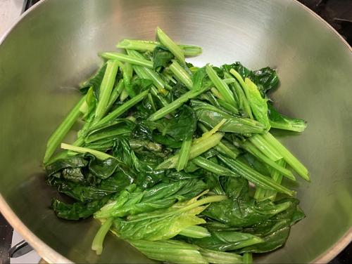 中強火でほうれん草をさっと炒め、緑色が鮮やかになったらすぐ火から下ろしておく。