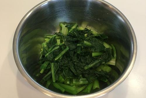 水気をしっかりと絞ったら、3cm幅に切る。小松菜をほぐしながらボウルに入れる。
