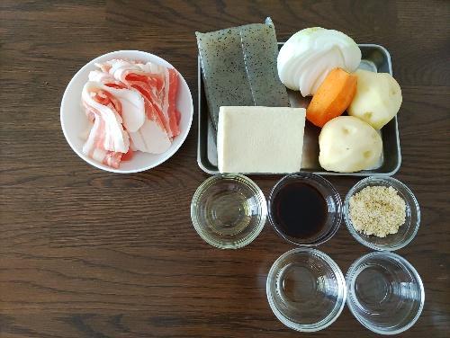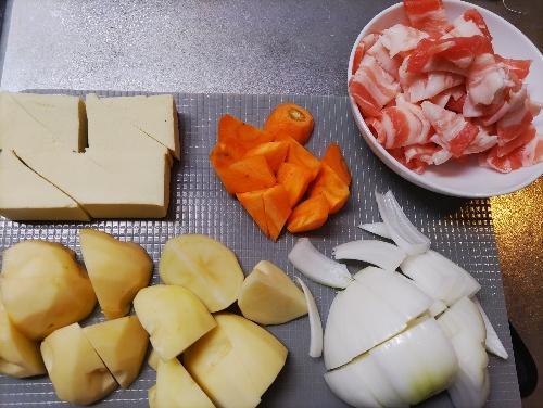 じゃがいも、にんじんを洗う。じゃがいもは芽を除いて皮をむき、一口大に切って水にさらす。にんじんは上下を落として皮をむき、小さめの乱切り、玉ねぎは上下を落として皮をむき、軽く洗ってくし切りにしておく。戻した高野豆腐も一口大に、豚肉は1?2cm幅に切っておく。