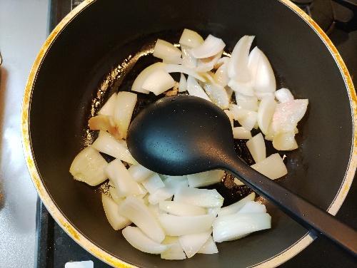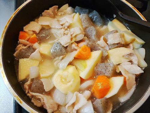 脂がにじんできたら玉ねぎ、豚肉を加えて軽く火を通すように炒める。 こんにゃく、じゃがいも、にんじんを加えて、全体的に脂を絡めるようにさっと炒める。
