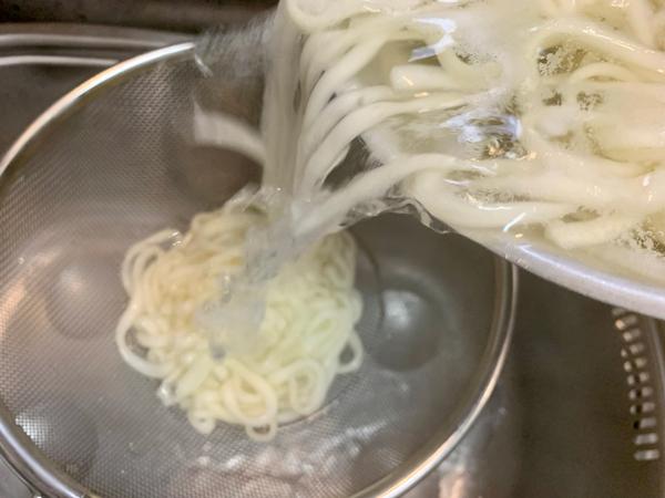 たっぷりの湯を沸かし、うどんを茹でて水切りする。