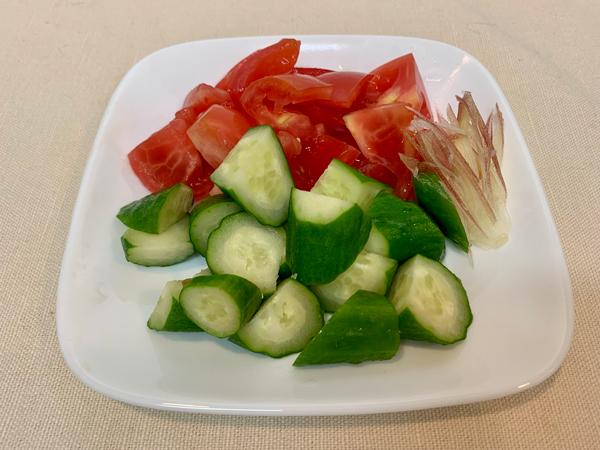 洗った野菜類は写真のように食べやすく小さく切り、これも冷蔵庫で冷やしておく。