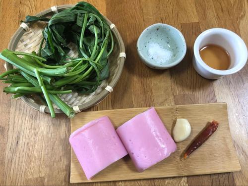 空芯菜は水でよく洗い、葉と茎に分け3cmほどに切る。かまぼこも空芯菜に合わせて短冊状に切っておく。ニンニクはみじん切りに、唐辛子はタネを抜き1mm幅に切る。