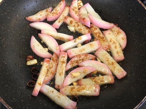 フライパンに少し多めに油を引きニンニク、唐辛子を入れ弱火で香りを出す。かまぼこを入れ中火にし、表面に焼き色が付くように焼いていく。1枚1枚丁寧にひっくり返すことで仕上がりがよくなるので、この工程は手を抜かず行う。