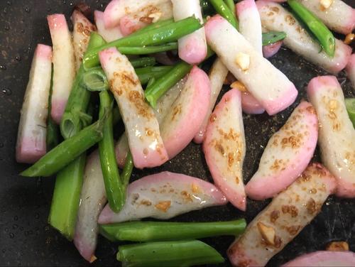 かまぼこがカリッとしてきたら空芯菜の茎から炒めていく。炒め物の基本、火が通りにくい物から順に炒めていこう。7割ほど火が入ったら空芯菜の葉を入れ、ヌックマム、砂糖で味付けをしたら完成だ。