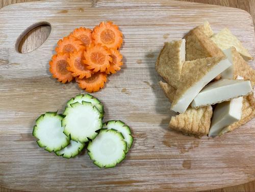 厚揚げは食べやすい大きさに三角形に切る。人参は皮をむき2mm幅の薄切りに、ズッキーニも2mm幅の薄切りにする。余裕があれば飾り包丁をいれると見た目がよくなる。