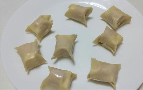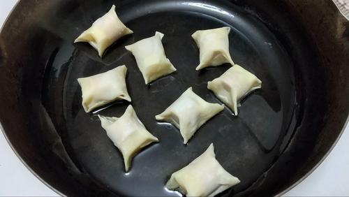 具材を真ん中に置いて、皮の端に水を付け、ちょっと押して止めながら巻いていく。ビラビラした薄い部分が飛び出ていると焦げやすい。巻き終わったら水の付いた指で全体的にきゅっと押す。