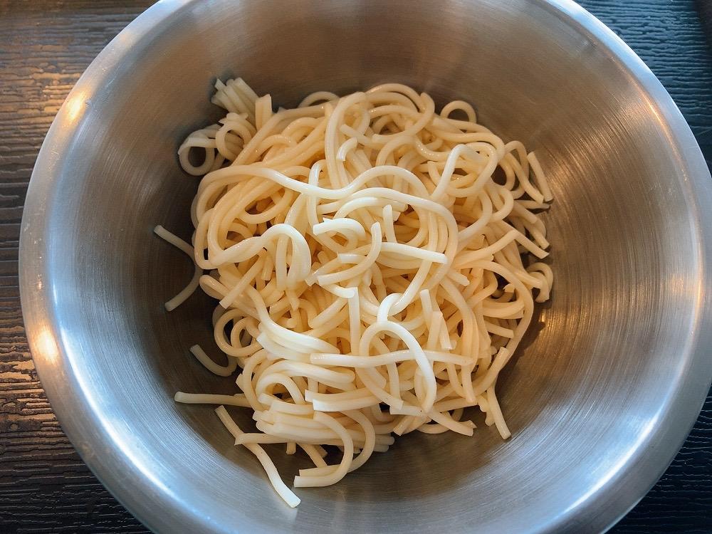 鍋に湯を沸かして、パスタを表示時間どおりに茹で、ザルなどにあげてしっかりと水をきっておく。それを3等分程度の長さに切ってから、ボウルに入れる。