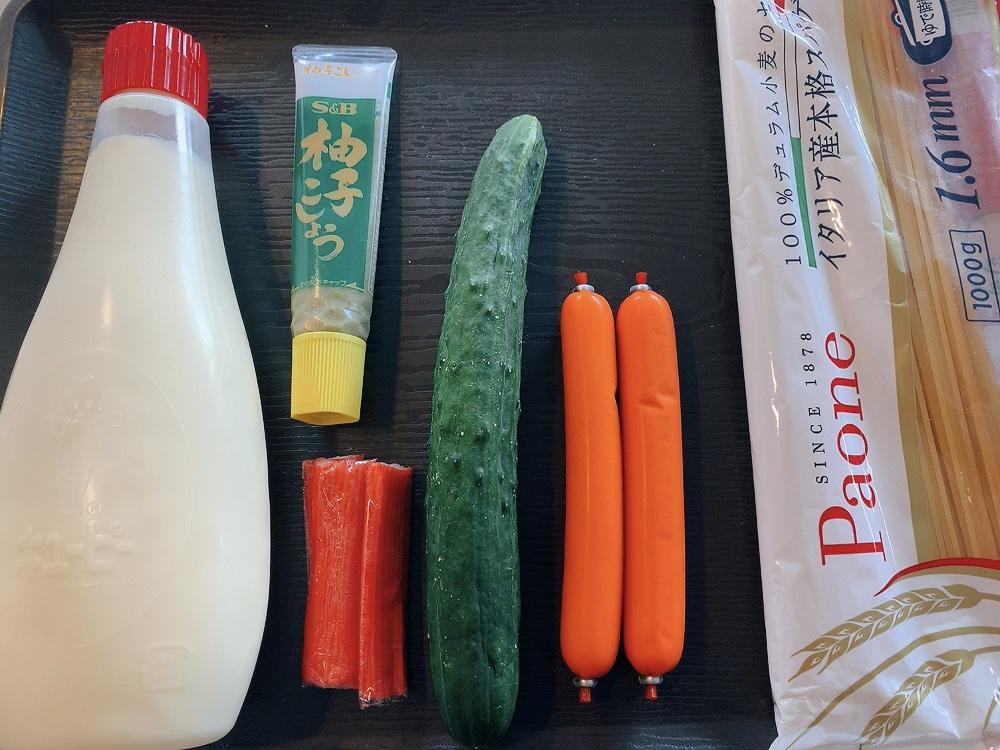 パスタが入っているボウルに魚肉ソーセージ、キュウリ、カニカマを加えて、さらにマヨネーズと柚子胡椒を入れて、混ぜ合わせたら完成となる。