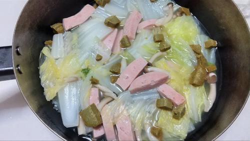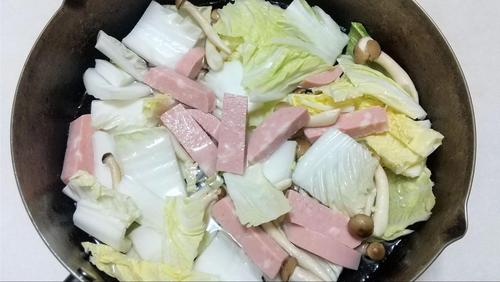 白菜としめじ、ポークソーセージを入れる場合、最初から煮はじめることができる。(アクが出る、固い、生の肉などを入れる場合は、一度炒めたり茹でてから煮はじめるとよい。)水を入れて強火で蓋を閉めて10分加熱する。