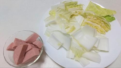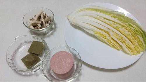 白菜は水分が90%以上を占めるので、加熱で縮むことを想定して、小さすぎないように意識して切る。加熱後の大きさを意識して、野菜を切ることは鍋の具材を切るときなどにも応用できる。ポークソーセージは、好きな大きさに切る。ほかの具材が少ない場合、大きい方が存在感が出て見栄えがよい。しめじは石づきを切り落とし、小房に分ける。