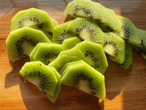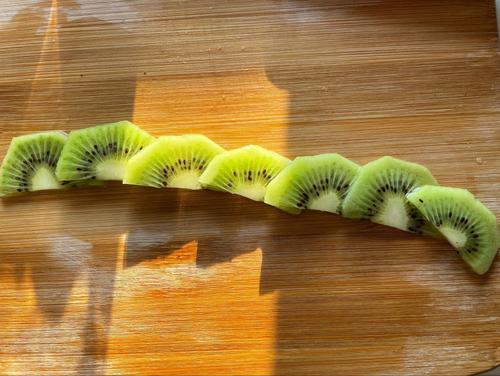キウイは皮をむき半分に割り、中心の芯が硬い場合は取り除く。1~2mm幅を目安に薄切りにする。あまり厚く切り過ぎると盛り付けが難しくなるので気を付ける。