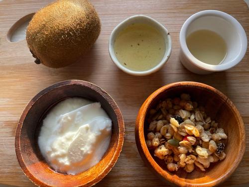 キウイが十分に柔らかくなったら半量を取り出し、1枚1枚並べる。端から丸めるようにキウイを巻いてバラの形にする。器にグラノーラ、残りのキウイ、ヨーグルトの順に入れ、最後にバラに巻いたキウイを乗せる。ミントを飾れば完成だ。