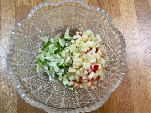 りんごは4等分にする。それぞれ芯を取り、1/4は飾り用にもう1/4はすり下ろし用にとっておく。半分はライム同様みじん切りにする。