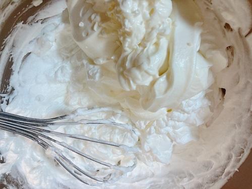 マスカルポーネとグラニュー糖(10g)をスプーンで混ぜておく。泡立てた生クリーム1/4程度をマスカルポーネに加えてよく混ぜる。その後、残りの生クリームの方へマスカルポーネを加えて、なじませるように混ぜる。