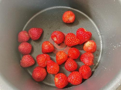 余ったいちごは小鍋に入れて、グラニュー糖(10g)と水(分量外、大さじ2)を入れて弱火にかける。いちごがしんなりしたら火からおろして冷ます。