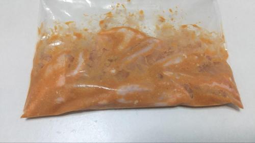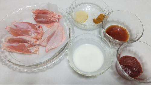調味料(ヨーグルト、ケチャップ、おろしにんにく、カレー粉、焼き肉のタレ、塩)を全部よく混ぜ合わせて調味液を作る。カレー粉は微粉なので、あらかじめ溶かしておかないと全体に行き渡りづらい。保存バッグに入れるとまんべんなく肉に付くのでおすすめ。カレー粉を容器などに入れると着色する場合がある。気に入った白い器などで漬けこむと色が落ちなくなることがあるので注意する。