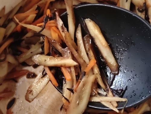 ひじきをざるにあげ、鍋にごま油を熱してごぼう、にんじん、ひじきを炒める。