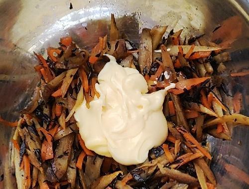 炒めた具材はボウルに移して冷ましておく。冷めたらマヨネーズを加えて和え、必要であれば塩で味を整える。