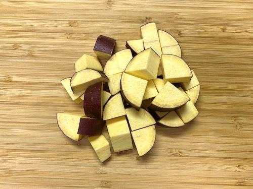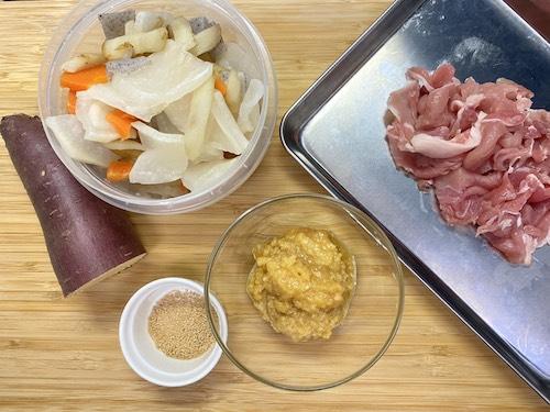 豚汁の具は水でさっと洗い流す。豚肉は食べやすい大きさに切る。さつまいもは1.5cm角に切る。