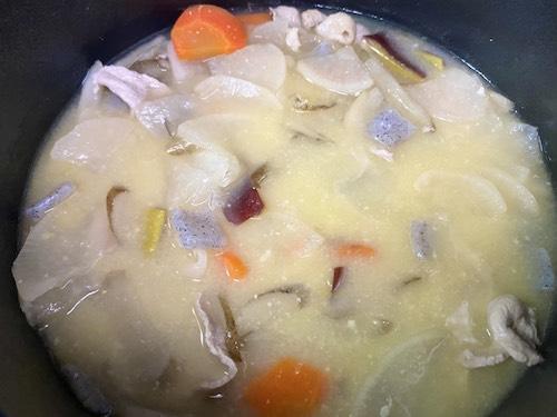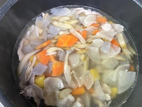 アクが出てこなくなったら豚汁の具と和風出汁を加え、さらに煮込む。