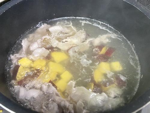 鍋に水800mlを入れて火にかける。沸騰したら豚肉を入れ、色が変わったらさつまいもを入れる。アクが出てきたら取る。