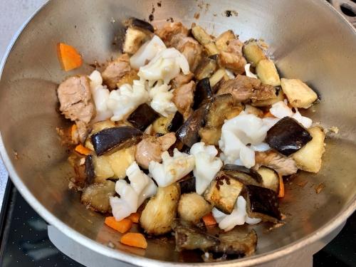 鍋に油少々を熱して人参、イカを先に入れ、焼いたナスと豚肉を加えてさっと炒める。