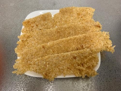 フライパンに揚げ油を190度に熱し、玄米をカラッと揚げる。すぐ揚がるので焦げないように注意する。