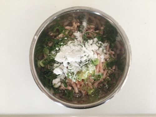 鶏ひき肉をボウルに入れ、小口ねぎ、片栗粉、醤油、しょうがチューブ、ゴマ油を加えて粘りがでるまでよくこねる。