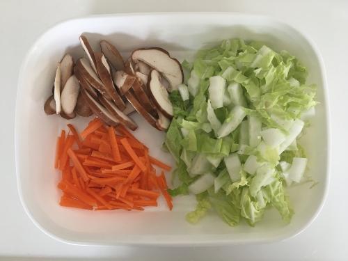 人参は皮をむき、太めの千切りにする。しいたけは水で濡らしたキッチンペーパーで汚れを拭き取る。汚れを落とせつつ、香りが逃げないので下処理としておすすめする。キレイになったら石づきを落とし、3mm幅に切る。白菜は流水で洗い、5mm幅に切る。