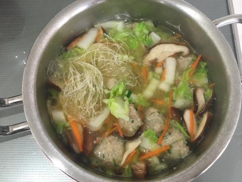 鶏団子に火が通ったら、白菜、人参、しいたけを加えてふたをして5分程煮込む。野菜がしんなりとしたら、春雨を加えてやわらかくなるまで煮る。最後に、醤油とゴマ油を加えて完成だ。スープ用春雨であれば、下茹でせずにそのまま使えるので調理時間短縮におすすめだ。