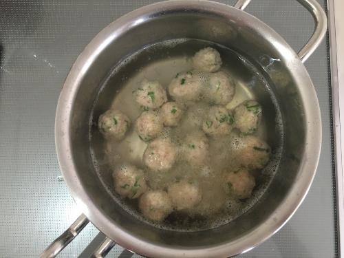 水500mlと鶏ガラスープを鍋に入れる。中火にかけて、沸騰したら一口大に丸めた鶏団子を入れる。煮崩れを防ぐために、鶏団子の表面が加熱されて色が変わるまで触らない。再び沸騰したらアクをとる。
