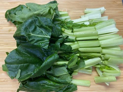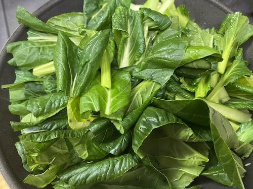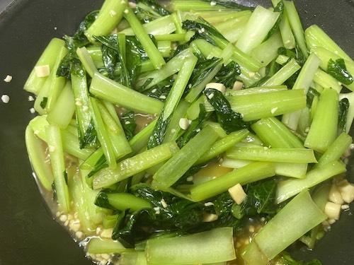 小松菜の茎全体に油が回ったら、葉を加え、さっと強火で炒める。