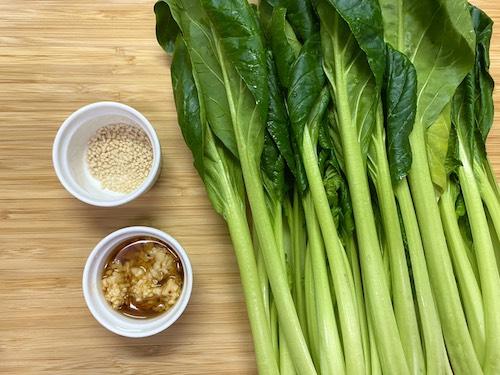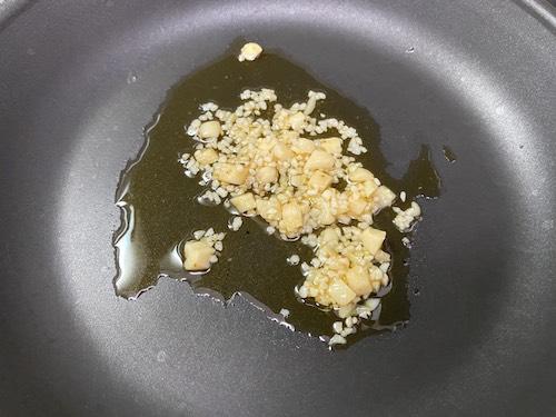 フライパンにごま油を熱し、にんにくを入れる。香りがたったら、小松菜の茎を加え、強火で炒める。